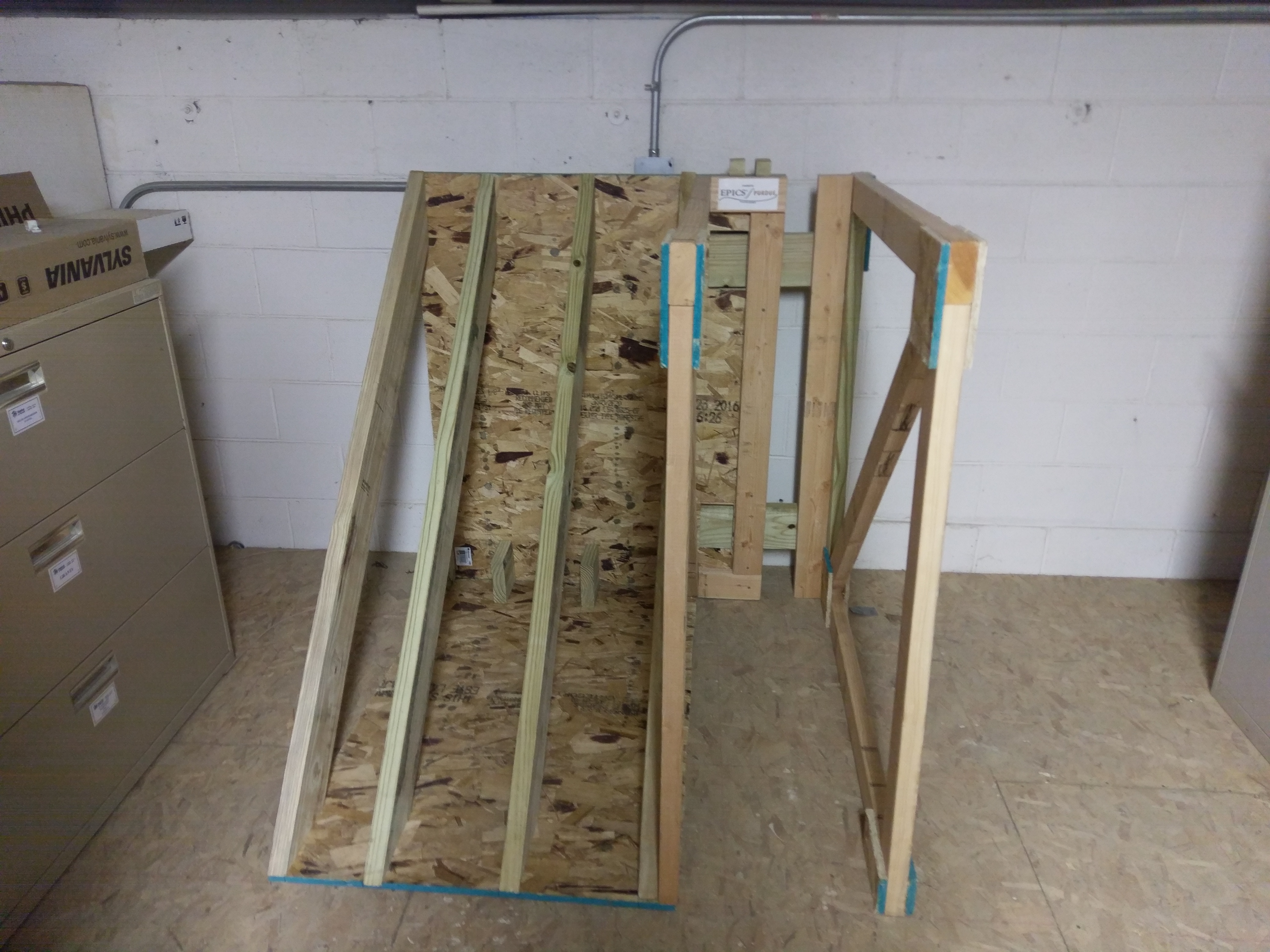 During the initial visit to the Habitat headquarters on September 8, 2016, Sue Hunter led the students upstairs through an unorganized loft space of the Habitat headquarters. The team noticed a slew of safety issues present in the loft and took on the task of creating a safe, easily traversable space. The team broke the overall safety issue into 5 main hazards. These hazards were: Framing Futures equipment, railings, hole in the wall, low beams, and signs.